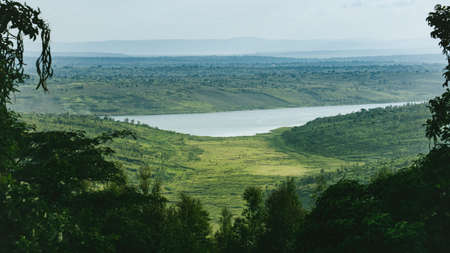 Tropical landscape with woods and lake in east african country