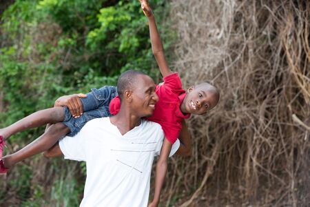 Arusha, Tanzania - December 24, 2019: African happy guy on the street with a bag of straw on head near home in Arusha, Tanzania, East Africa, close up