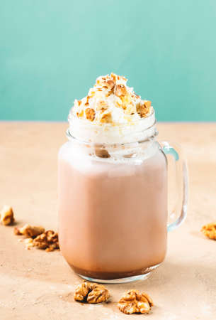 Winter hot dark chocolate or cocoa drink with whipped cream and crushed walnuts in glass jar, beige table, copy space