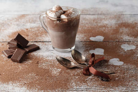 Hot chocolate with bitter chocolate on table