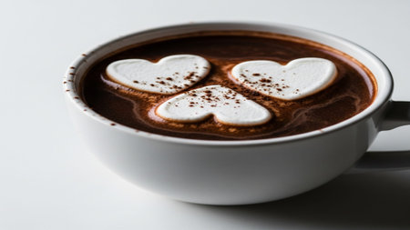 Luxurious hot chocolate in a refined cup, stark contrast against a pristine white background.