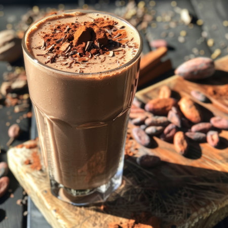 Chocolate smoothie in a glass topped with cocoa powder, healthy breakfast drink