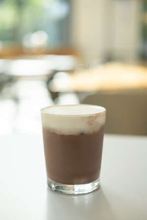 Close up of a glass of Iced Cocoa cool drink on table.