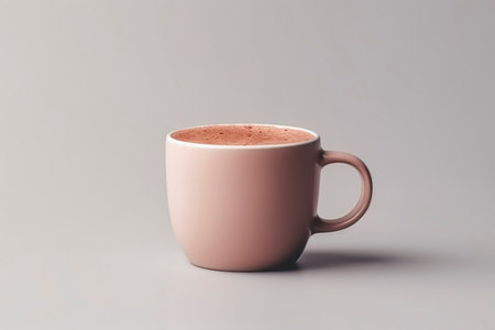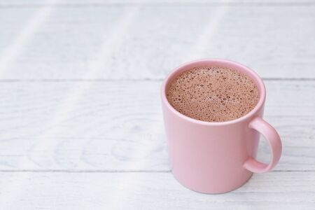 Hot chocolate in a pink ceramic mug isolated on white painted wood. Space for text.