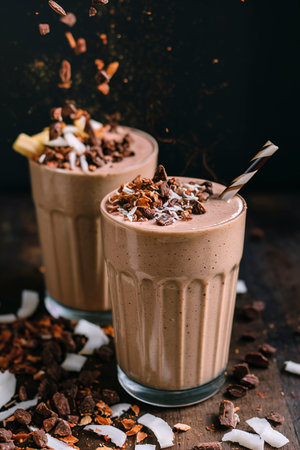 Chocolate banana smoothie with cocoa nibs and coconut flakes
