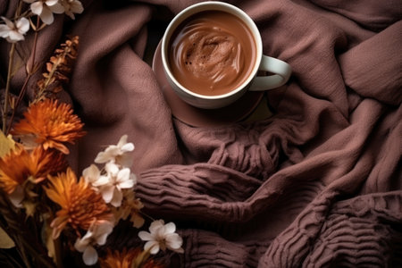 Fall themed still life Cocoa cozy blanket present preserved flowers and foliage Overhead shot