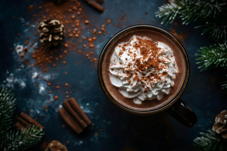 Christmas hot chocolate with whipped cream, cocoa powder, cinnamon sticks and pine cones on dark blue background