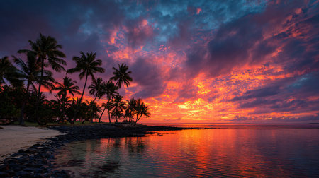 A scenic view captures a tranquil ocean with palm trees silhouetted against a vibrant sunset sky. The composition emphasizes the water's surface, reflecting the colorful sky, enhanced by the silhouettes of the trees. Suitable for various projects including travel and environmental themes.