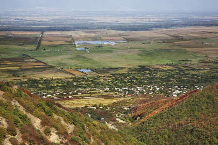 above view of village in Alazani plain from Signagi town in summer morning, Georgia