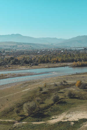 View at Mtkvari river or Kura river from the rock cave city Uplistsikhe in Georgia, Asia. River bank with autumn trees and hills in the background