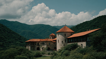 An architectural structure with a reddish-brown roof and circular towers is centered within a mountainous landscape. The scene showcases a range of green tones, from the forested hills to the surrounding vegetation, illuminated by diffused daylight. Suitable for illustrating travel destinations or showcasing historical places.