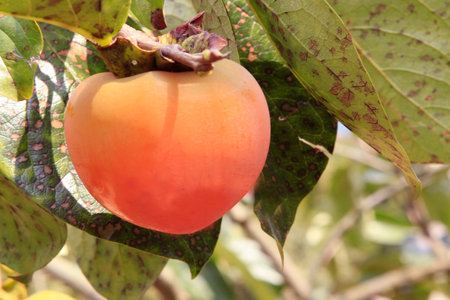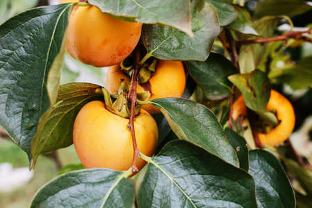 Orange fruits of persimmon hanging on tree, edible fruit,
