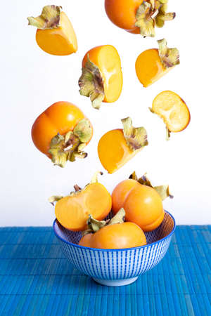 Persimmon falling into a ceramic bowl on a blue carpet and white background