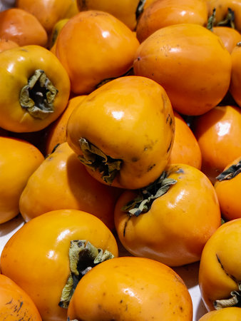 Fresh persimmons are available for sale in the store. Rich in vitamins and nutrients. Juicy and delicious fruity option. An exotic flavor perfect for the fall harvest season.
