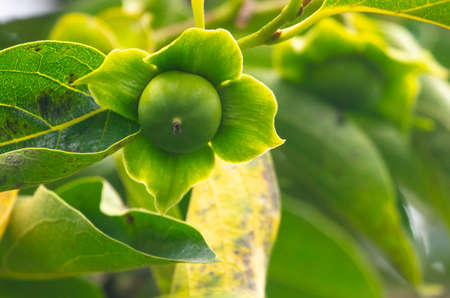 Green persimmon on the branches of a tree. Close-up