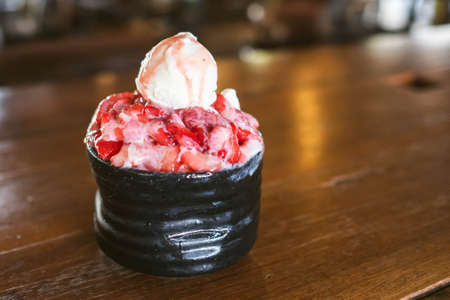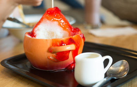 Strawberry Bingsu, The shaved ice with cream milk and fresh strawberry on the table in restaurant.