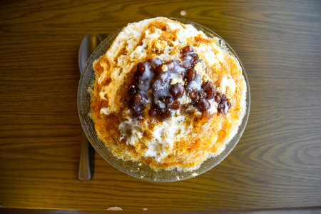 Thai Milk Tea shaved ice Bingsu Dessert on wood table