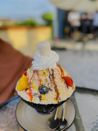 eating mango shaved ice with colorful dessert, famous Taiwanese snacks at Taiwan