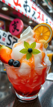 Delicious dessert featuring shaved ice topped with fresh fruit and syrup at a vibrant Japanese street stall