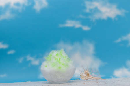 Korean shaved ice or snow cone (bingsu or bingsoo) dessert, Japanese Tea Matcha flavored with condensed milk and sweet caramel syrup topping. Traditional Asian Snacks, Sweets, Treats and Food concept.