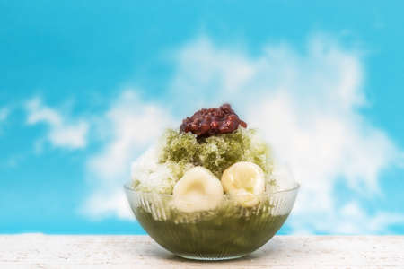 Bingsu Green Tea with Red Bean - Korean Dessert on Wooden Table Great For Any Use.