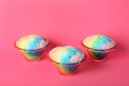 A colorful mound of shaved ice sits in a glass, ready to be enjoyed on a hot summer day