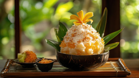 Bingsu mango fruity topping popular Asian style summer dessert sweet ice milk shaved