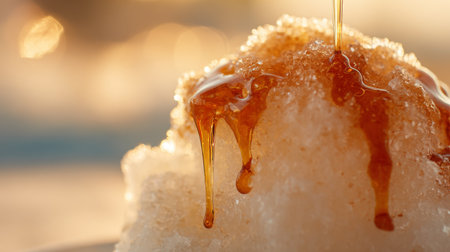 This image captures a close-up of glistening sugar snow topped with a drizzle of golden syrup, evoking winter treats in a warm, inviting atmosphere.