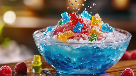 Bowl of vibrant shaved ice topped with blue raspberry syrup, gummy bears, and a splash of condensed milk for a fun dessert.