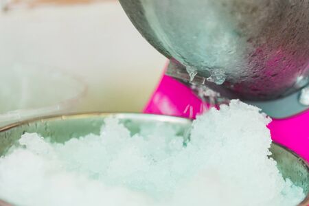 Ice come out of Shaved ice machine, making thai shaved ice desssert.