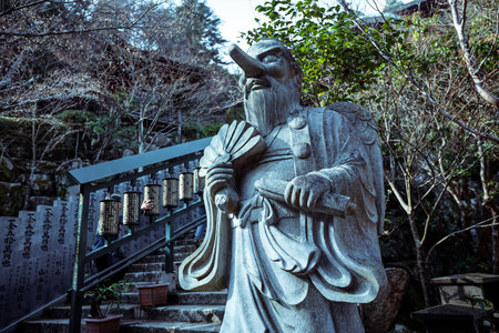 Itsukushima, Japan - January 09, 2020: Stone statue near the Buddhist Temple