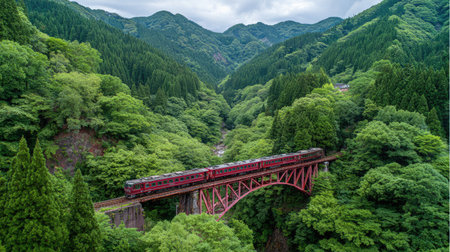 Experience the beauty of nature with a train gracefully crossing a red bridge surrounded by lush greenery and majestic mountains, creating a stunning landscape.