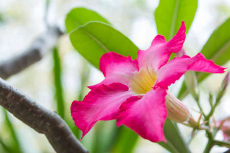 Adenium flower blossom with green leaves in the garden.