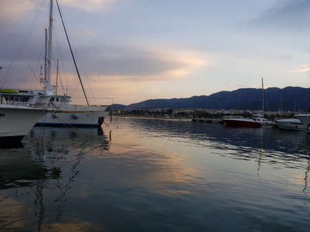 Limassol, Cyprus, aerial view of sunset above yachts and boats port in famous mediterranean city resort.