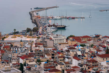 Aerial view of Zakynthos (Zante) town, Greece. Summer morning on the Ionian Sea. Beautiful cityscape panorama of Greece city. Traveling concept background.