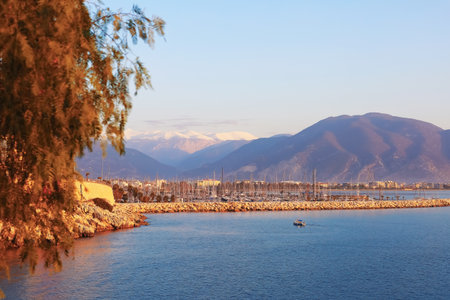 Overhanging tree with mountain marina view in Finike