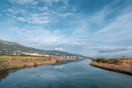 Beautiful morning seascape. Bright blue sky with cumulus clouds and a calm sea. The mountains and the city on the horizon. Dawn above the sea.