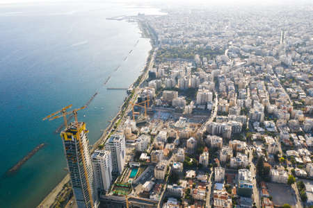 Aerial view of Limassol panorama from air. Cyprus resort town and sea water, drone photo.