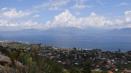Coastal village in Greece captured during daytime, featuring picturesque houses nestled along the shoreline. Expansive views of tranquil sea and surrounding mountains create a serene atmosphere.