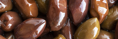 Close up marinated kalamata olives, product of Greece and Cyprus in oil as background. Long horizontal banner. Macro.