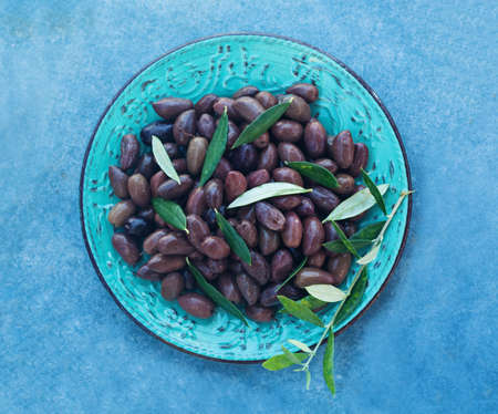 Delicious ripe black olives in a bowl, from above. Middle eastern and Mediterranean traditional snack or appetizer, light and healthy food, top view .