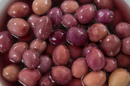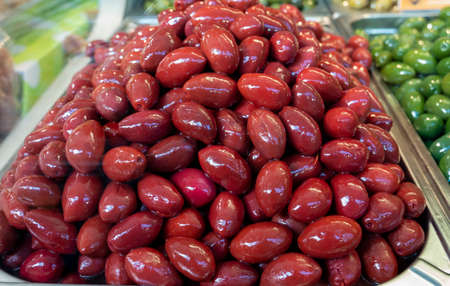 Red olives close up on market, healthy vegetarian food background