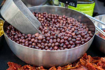 Sicilian black olives in spicy vegetable market sales