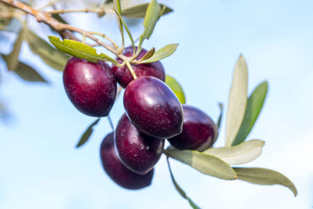 closeup of olive tree branch with ripe organic Kalamata olives against blue sky