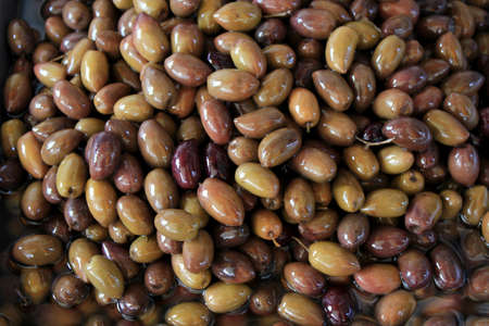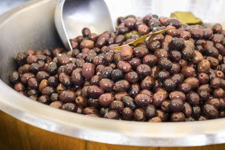 Brown Greek pickled calamata olives for sale on farmers market close up
