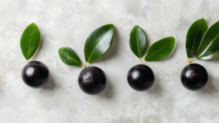 Vibrant red fruits nestled among lush green foliage, artfully arranged in a rustic wooden dish against a soft, neutral backdrop.