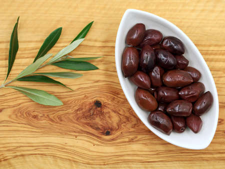 Kalmata olives in white bowl on olive wooden board with branch, top view