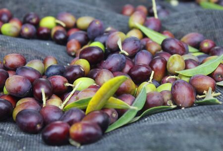 Process of harvesting collecting olives, pile bunch of fresh harvested olives collected on net, close up macro view, dark and green kalamata olive fruits in a sunny day, Ionian sea islands, Greece