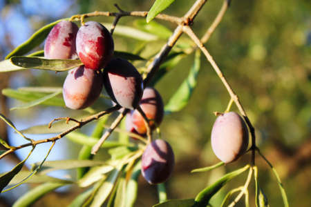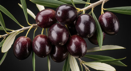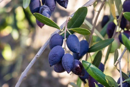 cluster of ripe kalamata olives hanging on olive tree branch with blurred background