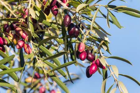 Closeup view photography of organic olive trees with ripening olives at sunny blue sky background.
